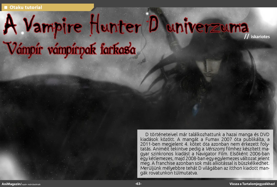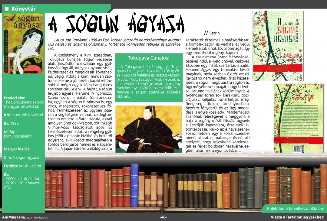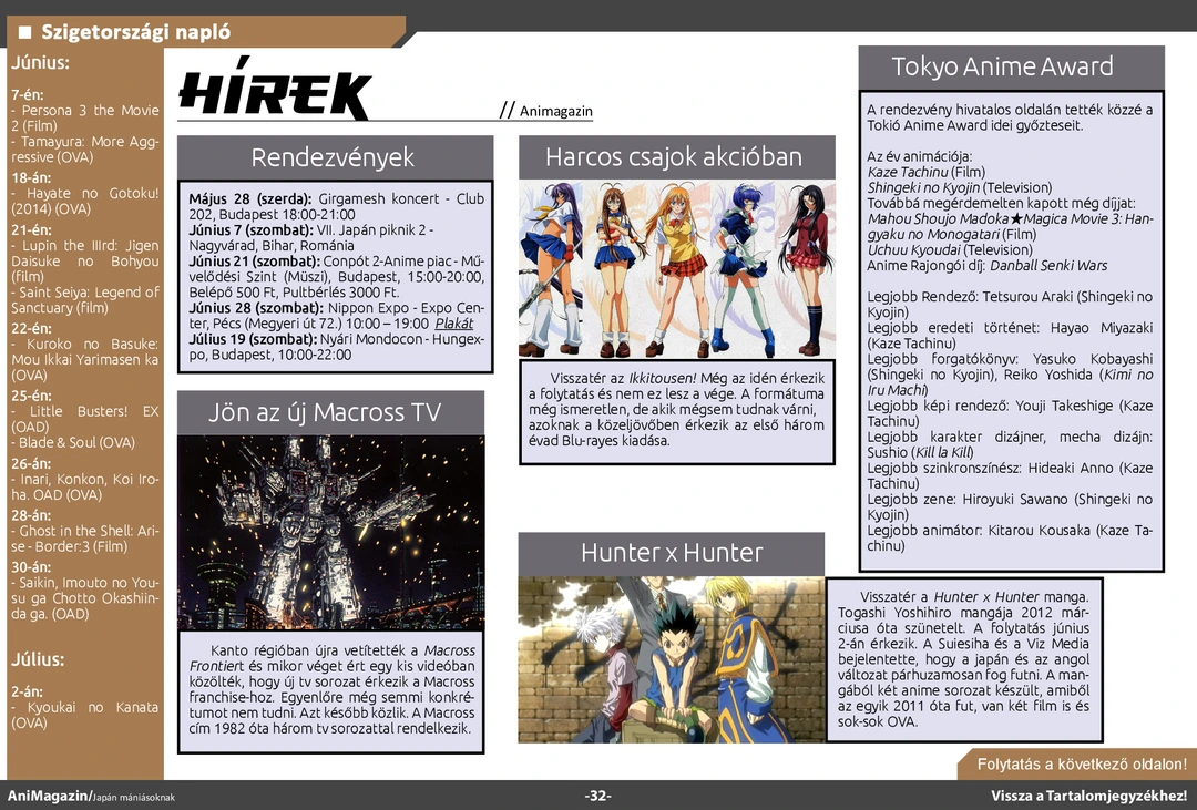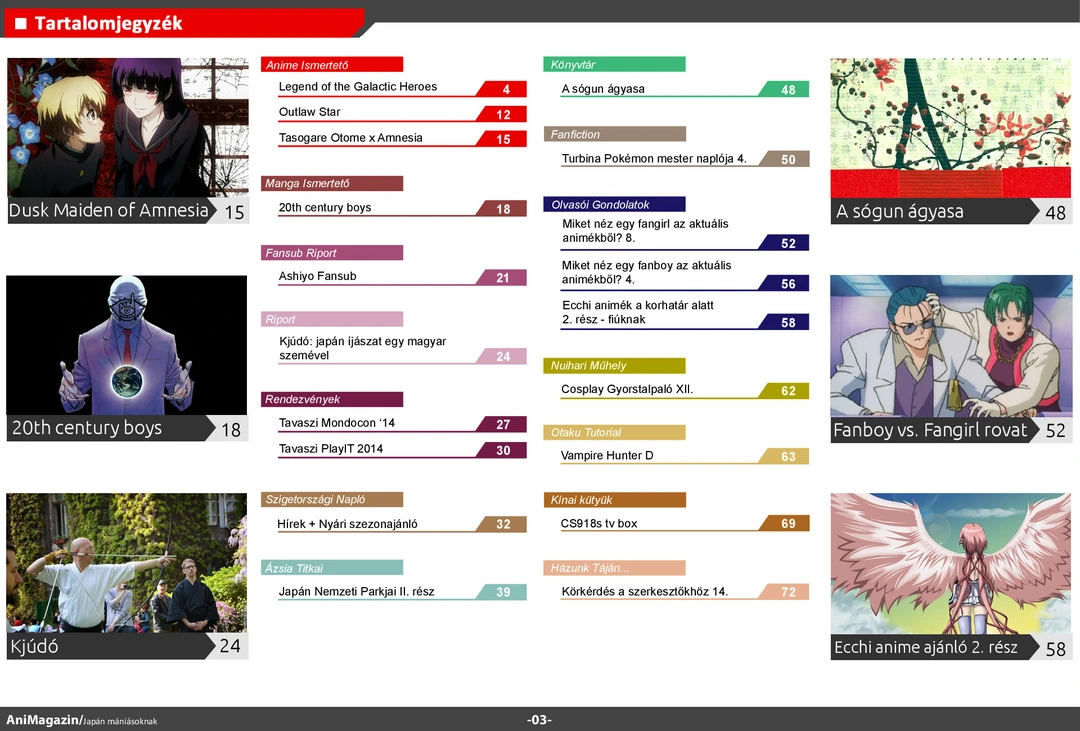 Outlaw Star és 20th Century Boys ismertető, Ashiyo Fansub interjú, kjúdó klub riport, bemutató a japán nemzeti parkokról, D, a vámpír vadász univerzumáról és a nyári anime szezonról, Mondocon és PlayIT beszámoló, fangirl&fanboy rovat a tavaszi szezon pár animéjéről, ecchi ajánló és rengeteg más szuper cikk várja olvasóit az ingyenes online AniMagazin legújabb számában!