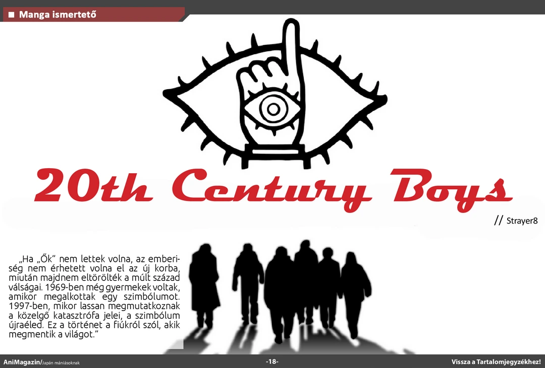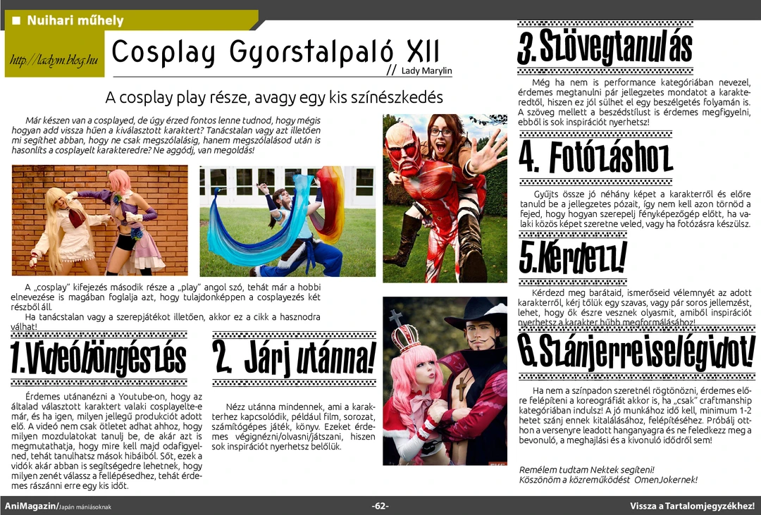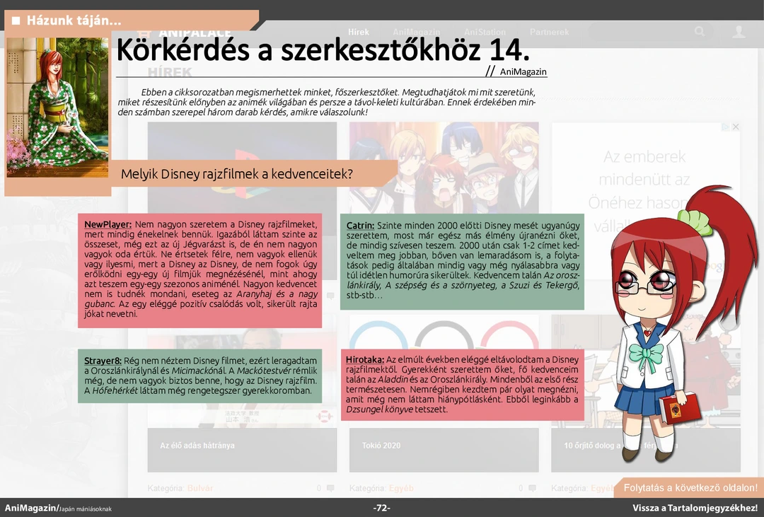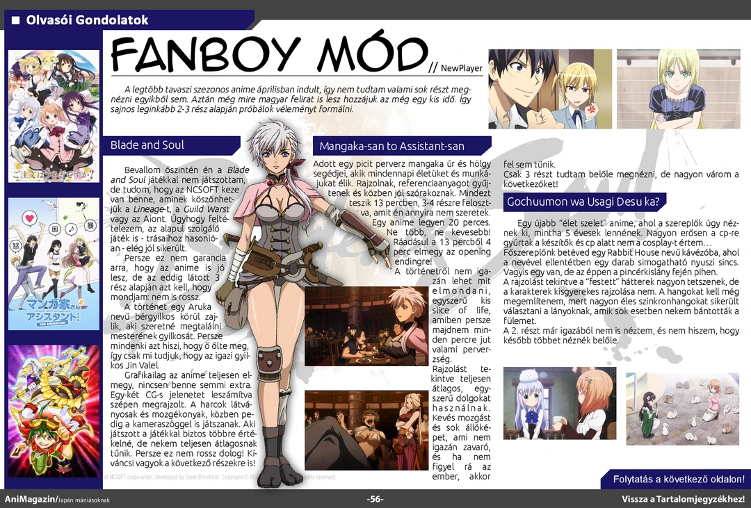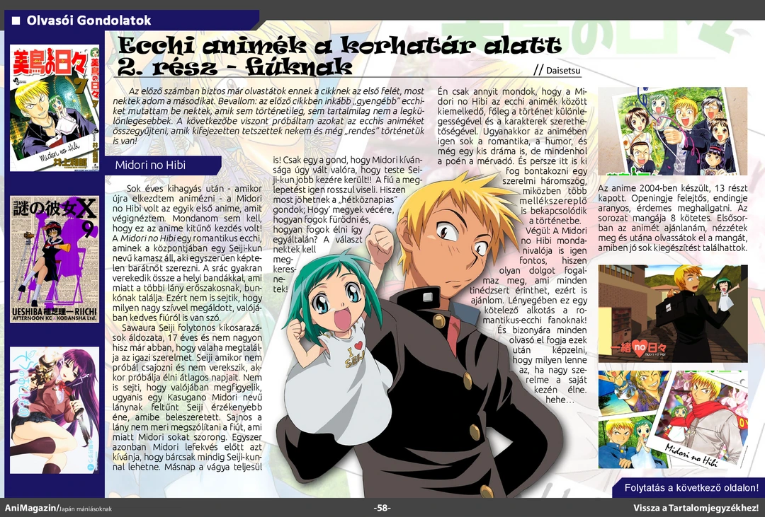 Outlaw Star és 20th Century Boys ismertető, Ashiyo Fansub interjú, kjúdó klub riport, bemutató a japán nemzeti parkokról, D, a vámpír vadász univerzumáról és a nyári anime szezonról, Mondocon és PlayIT beszámoló, fangirl&fanboy rovat a tavaszi szezon pár animéjéről, ecchi ajánló és rengeteg más szuper cikk várja olvasóit az ingyenes online AniMagazin legújabb számában!