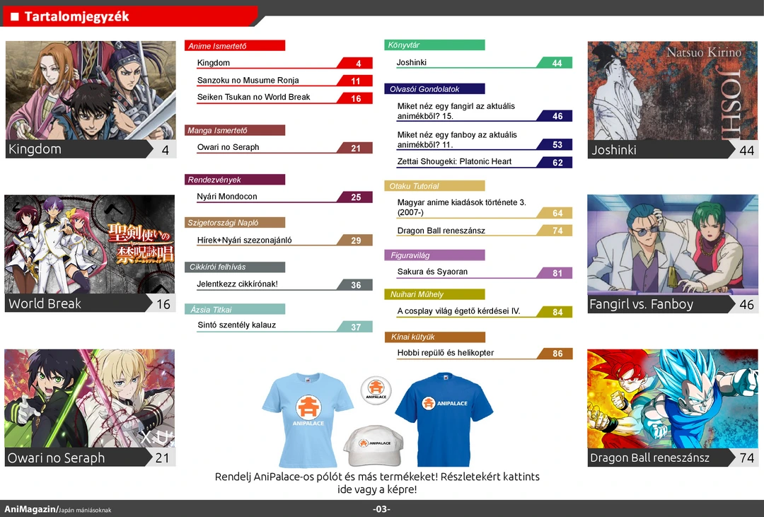 Kingdom, Ronia, Owari no Seraph ismertető, Nyári MondoCon beszámoló, Sintó szentély kalauz, fangirl&fanboy rovat az aktuális animékről, anime DVD kiadványok hazánkban, figura ajánló és további bemutatók az ingyenes online AniMagazin legújabb számában!