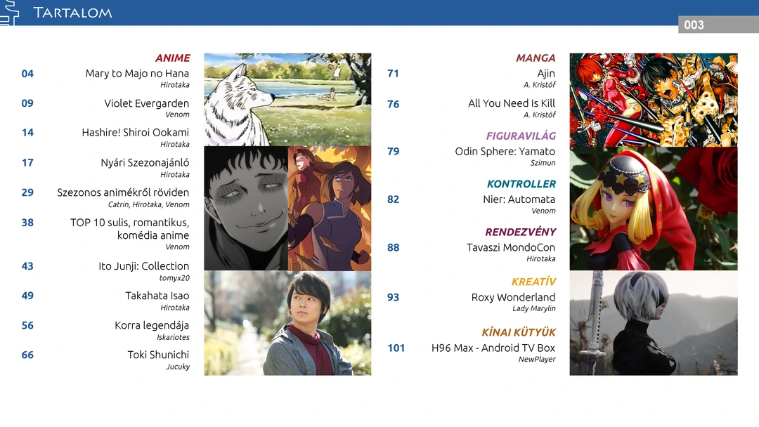 Violet Evergarden, Hashire! Shiroi Ookami és Ajin ajánló, megemlékezés Takahata Isao munkásságáról, TOP 10 sulis romantikus komédia, Korra legendája és Toki Shunichi bemutató, Tavaszi MondoCon beszámoló, nyári szezonajánló, tavaszi szezonvélemények, Roxy Wonderland cosplay interjú, figura ajánló és további remek cikkek az ingyenes online AniMagazin legújabb számában!