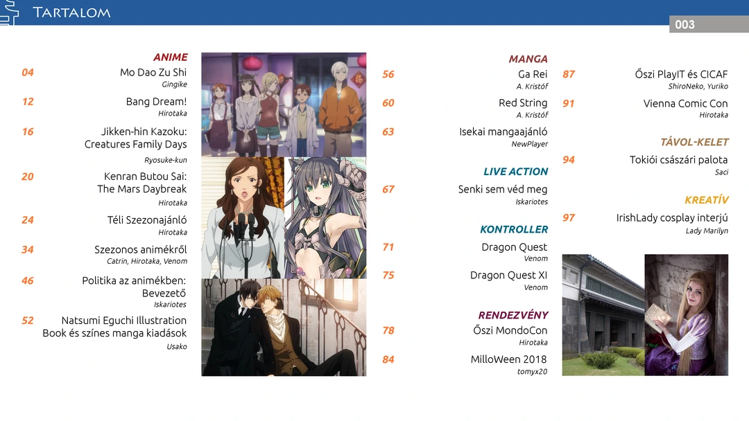 Bang Dream!, Jikken-hin Kazoku és Ga Rei ajánló, Bunny Girl, Zombieland, Golden Kamuy 2, Index 3, Banana Fish, Dakaretai Otoko… vélemények, téli szezonajánló, isekai mangaajánló, rendezvény beszámolók, IrishLady cosplay interjú, Hoozuki artbook, Dragon Quest és Politika az animékben bemutatók, valamint további remek cikkek az ingyenes online AniMagazin legújabb számában!