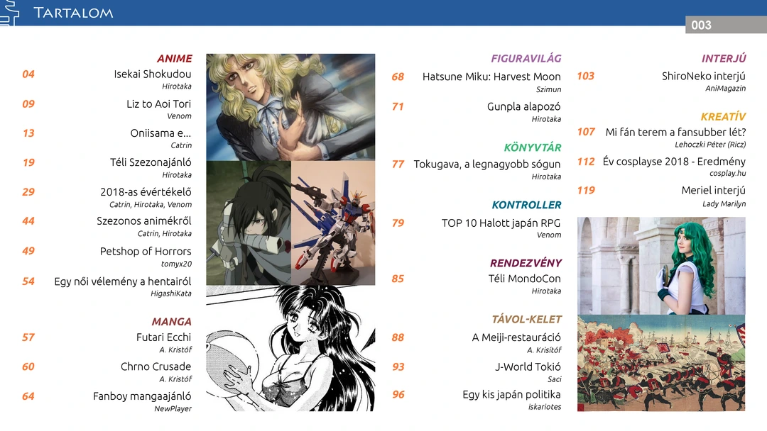 Liz to Aoi Tori, Oniisama e… és Futari Ecchi ajánló, 2018-as anime évértékelő, Petshop of Horrors anime vs manga, egy női vélemény a hentairól és beszámoló a fansubber létről, téli szezonajánló, ShiroNeko és Meriel interjú, a 2018-as év cosplayese pályázat nyertesei, Hatsune Miku figura és Gunpla bemutató, ismertető a Meiji-restaurációról, valamint további remek cikkek az ingyenes online AniMagazin legújabb számában!