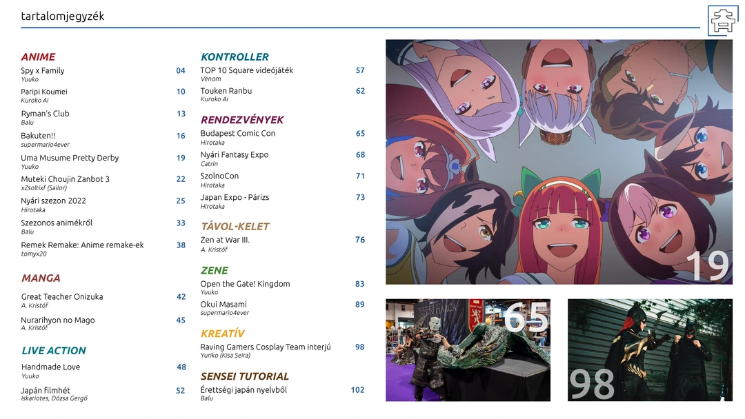 Paripi Koumei, Ryman’s Club, Bakuten!! és Uma Musume Pretty Derby anime ajánlók, vélemények a tavaszi szezonos animékről, nyári szezonajánló, retro, remake és manga bemutatók, Japán filmhét és con beszámolók, Top10 Square videójáték és Touken Ranbu ajánlók, Raving Gamers Cosplay Team interjú, és további remek cikkek az ingyenes, online AniMagazin legújabb számában!