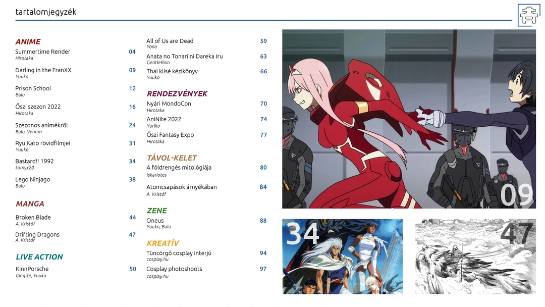 Darling in the FranXX, Prison School, Bastard!! 1992 és őszi szezonos anime ajánlók, vélemények a nyári szezonról, manga bemutatók, rendezvény beszámolók, KinnPorsche, All of Us are Dead és Anata no Tonari ni Dareka Iru dorama ajánlók, Tüncörgő cosplay interjú, és további remek cikkek az ingyenes, online AniMagazin legújabb számában!